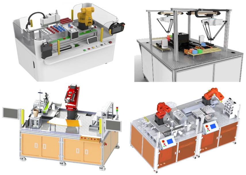 機器人教學平臺主體包含料倉模塊,機器人模塊,轉盤模塊,抓手模塊,視覺檢測模塊,分選模塊,料盤輸送模塊,皮帶線輸送模塊,系統總控工作站等必備或選配模塊。